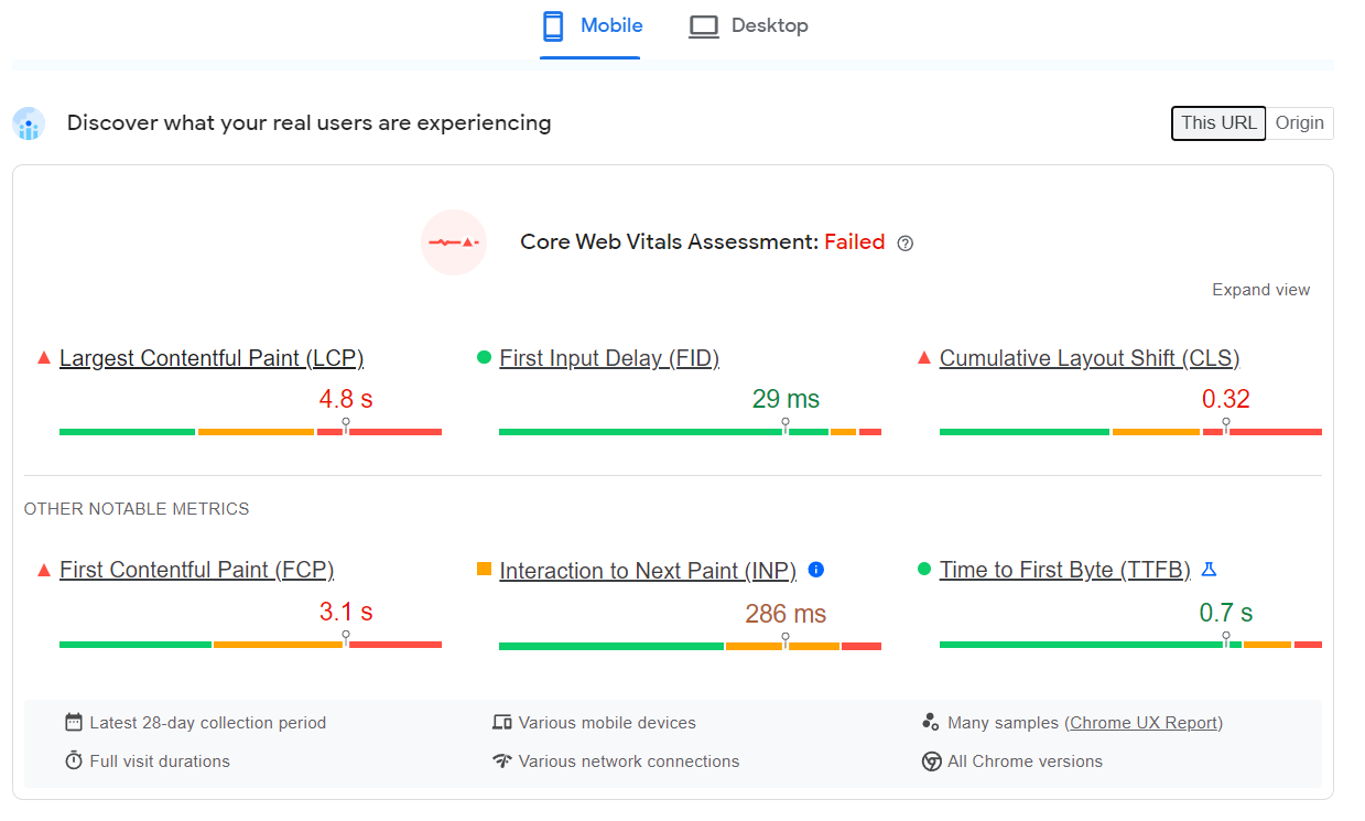 The scores may also be inconsistent. PageSpeed metrics rely on aggregate user data, meaning experiences can vary across locations and devices. These metrics fluctuate due to server load, routing, and overall traffic among other factors. To ensure accuracy, running multiple tests at various times and averaging the scores is helpful (3). If the client's 'failed' score is genuine, researching the contributing factors will be necessary.