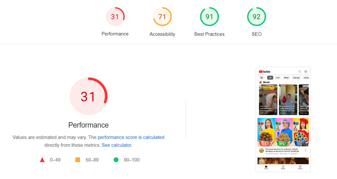 Visitors aren't concerned about your Google PageSpeed Insights score; they just want quick access to your content - a ‘good experience’. The value of PageSpeed Insights is not so much the score it delivers as the way it helps pinpoint issues to optimize and enhance both actual and perceived loading times. Also, not every site can achieve 100% while delivering the most important content. For instance, even Google's YouTube doesn't meet all Core Web Vitals criteria.