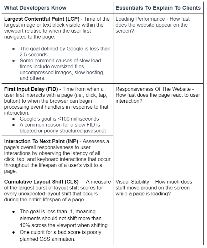 While developers will consider much more detailed and technical definitions of these CWV metrics, they’re a good starting point when it comes to talking with clients in layman’s terms.